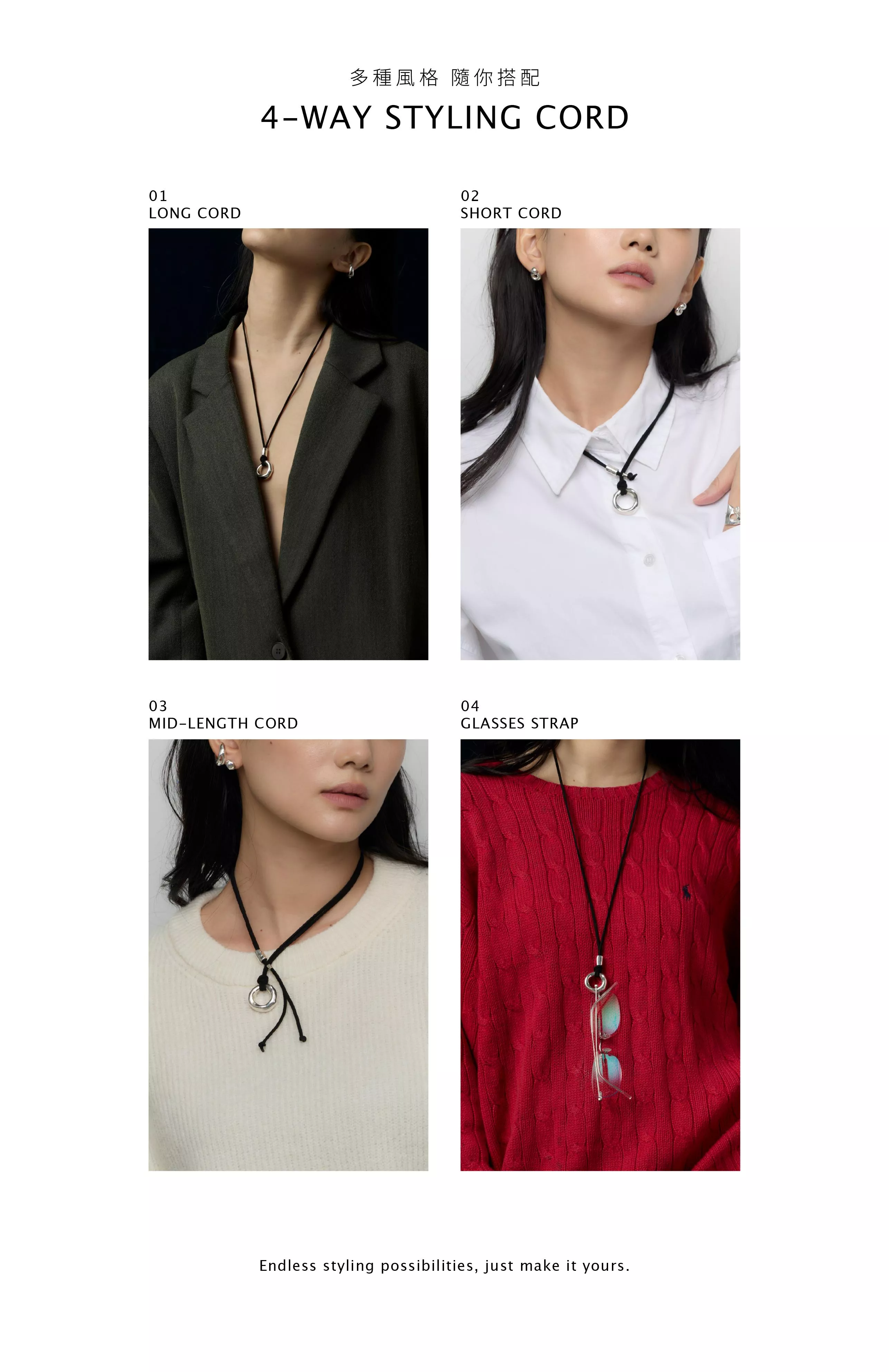 三種佩戴方式,長鍊・短鍊・眼鏡掛繩